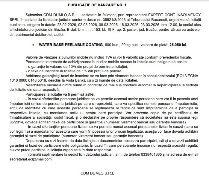 Subscrisa CDM DUMLO S.R.L. – societate în faliment, organizează licitații publice cu strigare în următoarele date:
