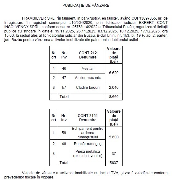 Se vinde, prin licitatie publica, imobilul situat in localitatea Gologanu, jud. Vrancea compus din teren intravilan in suprafata de 371 mp si constructia C1 – brutarie, in suprafata de 245 mp.