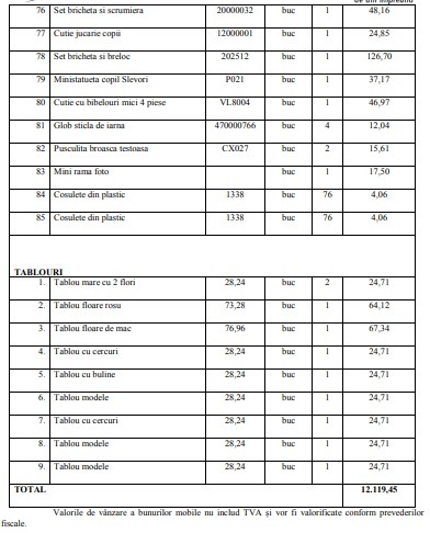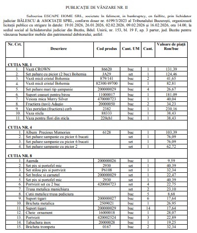🔹 Se scot la vânzare, prin licitație publică cu strigare, bunuri diverse din patrimoniul ESCAPE HOME SRL, printre care: