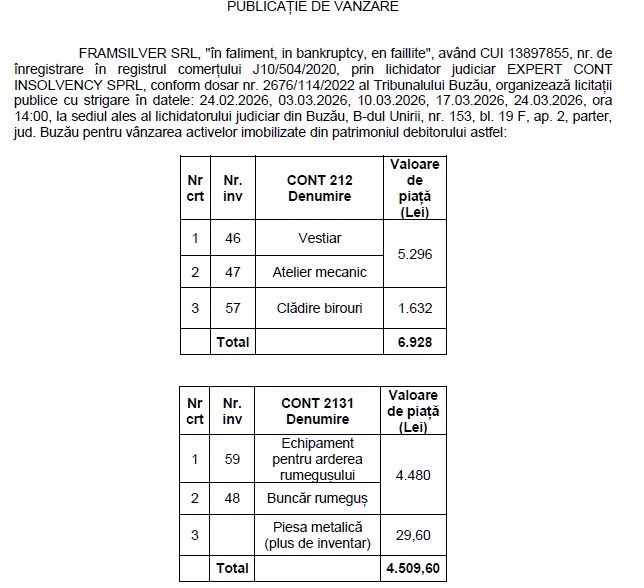 Informații suplimentare la sediul lichidatorului judiciar și la